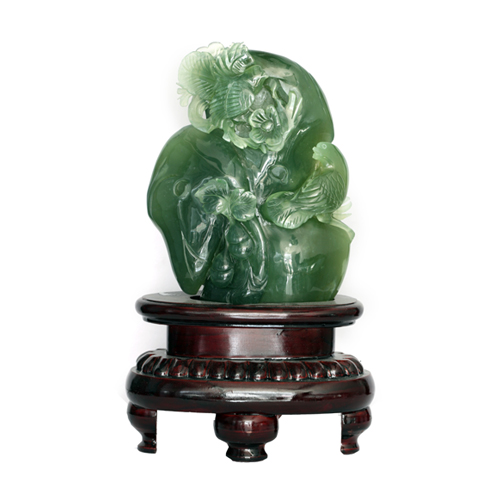 此件作品造型美觀大氣,雕工繁縟、技藝精湛。翠色清新亮麗,寓意吉祥討喜。兩只喜鵲于枝頭跳躍,回頭張望,四目相對,含情脈脈,十分惹人喜愛。寓意喜事連連,喜上加喜!
