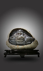 彌勒佛方臉凸頂,彎眉笑眼,鼻頭高挺,開臉較好,坦胸露腹。整體祥瑞充盈,增添了更多靈性及喜氣。彌勒大肚能容,容天下難容之事,笑口常開,笑天下可笑之人。警醒世人,凡事看開看遠,心情舒暢,笑對人生,才能心寬體胖,無憂人生,福氣自在眼前! 水膽瑪瑙,乃自然界形成的瑪瑙中包裹有天然形成的水,在瑪瑙制品中尤為稀罕。玉器雕琢工藝師們在挑選瑪瑙料石中,首先要確定其有“水”,再用切割機把瑪瑙切開,切開時又要恰到好處:切面離水膽遠了,看不見水;切得過近了,又容易把“膽”切破、破了“膽”的瑪瑙就失去了其雕琢的價值,一件成功的水膽瑪瑙雕件其雕琢之難和其工藝價值之珍貴。