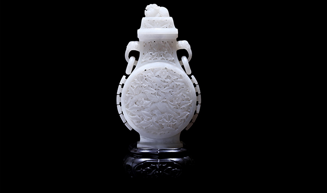玉質潤白細糯、晶瑩飽滿、料大難得,細膩滋潤如羊脂,通透如瑩瑩白雪。整體以立體鏤雕為主,刀法精細,隨形施藝,惟妙惟肖的圓巧妙融入其中,構成香壺吉祥圓滿的視覺效果。體形弧曲圓渾,弧度對稱自然,壺頂羊雕造型,惟妙惟肖,點睛之筆,清潤富貴中包含著古樸雅致之情。作品將玉堅潤不渝的美德與吉祥寓意結合,與中國文化高度契合,不僅極具美感,更傳遞出富貴吉祥、福氣安康、財運連綿、節節高升等美好祝福。