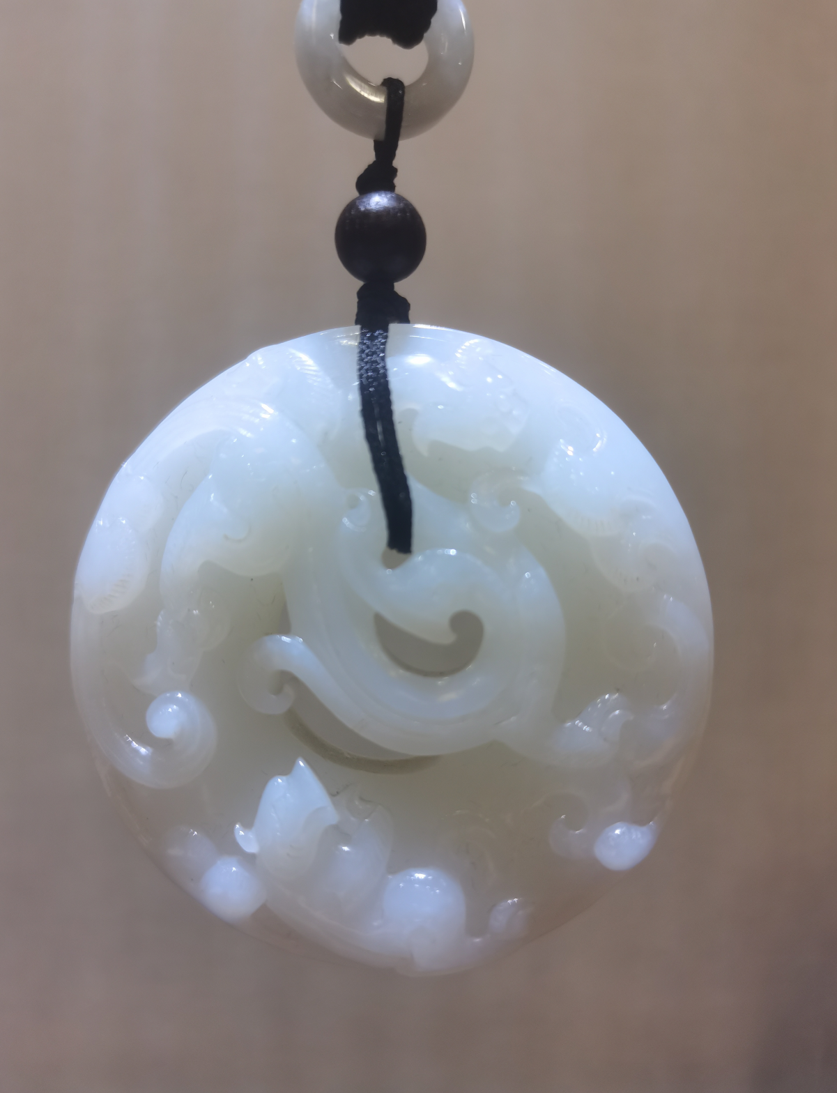 此款浮雕祥龍掛件,羊脂白玉,細膩油潤。雕刻栩栩如生,龍身雄健,龍爪強勁有力,盤旋而上,吞云吐霧,祥瑞之氣縈繞其間;整體線條圓潤,賦予張力,將龍升騰之勢描摹的形神盡致,是為不可多得的收藏佳作。