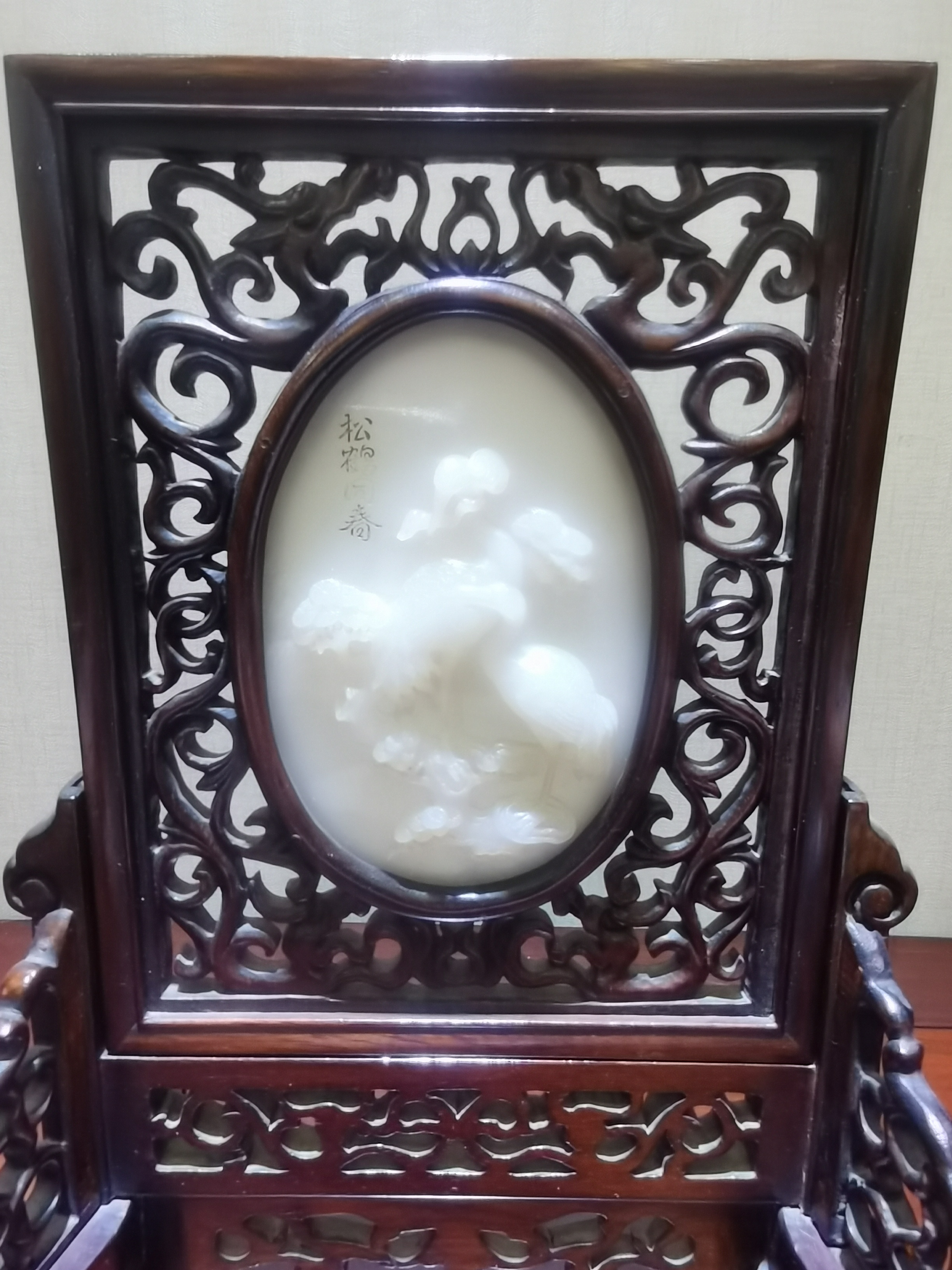 此玉牌玉質溫潤,細膩光潔,油性十足。雕工精湛,造型輪廓簡練,細節到位,栩栩如生。裱藏于紅木屏風中,古色古香,別具韻味。更增添了收藏者高雅的氣質。