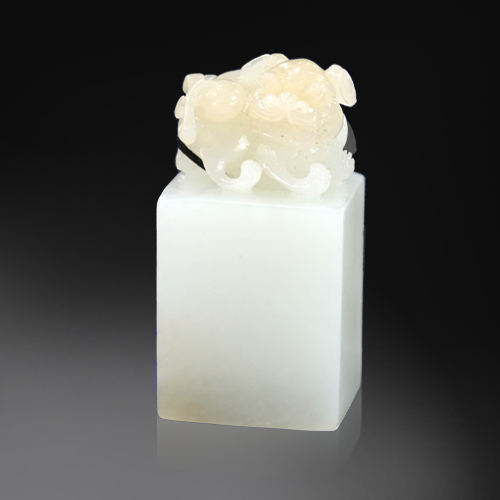 這枚白玉貔貅印章質地溫潤細膩,手感極佳。瑞獸為鈕,牛蹄形足,寬長獅形尾。回首狀,雙眼圓睜,剛勁威猛,上身有糖色,寓意鴻運當頭,這種取用俏色的方法現代而唯美,適宜作辟邪旺財之隨身攜物。