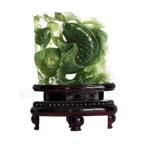 以翻騰的浪花為背景,左下角精心鏤空雕琢魚簍,兩尾鯉魚翹首翻騰,錯落有致,顯示出勃勃的生機(jī),整體設(shè)計恰到好處。魚通“余”,有年年有余、世代富足之意。