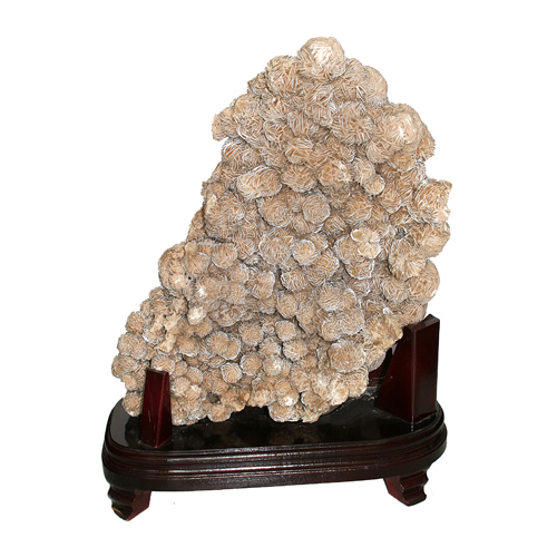 沙漠玫瑰因開采困難,產(chǎn)量稀少,形狀奇特,所以,在天然奇石市場(chǎng)上占有特殊地位,具有極其珍貴的研究和收藏價(jià)值。它有一瓣瓣玫瑰石瓣,逼真地開放著。是細(xì)沙在幾千萬(wàn)年甚至幾萬(wàn)萬(wàn)年的風(fēng)雨雕塑中風(fēng)化而形成的。其中還有零星的細(xì)沙鑲嵌在花瓣的中間。它沒有玫瑰花的葉和刺,只有花朵默默地開放在戈壁灘中,但它永遠(yuǎn)不會(huì)枯萎,也不會(huì)凋零。